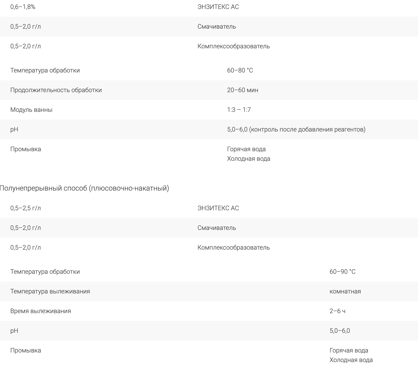 ЭНЗИТЕКС АC используется в процессах расшлихтовки текстильных материалов для удаления крахмальной шлихты и подготовки ткани к дальнейшим технологическим операциям (отварка, беление, крашение).
