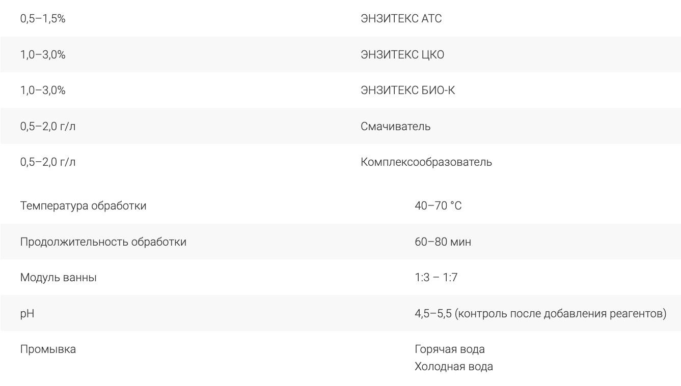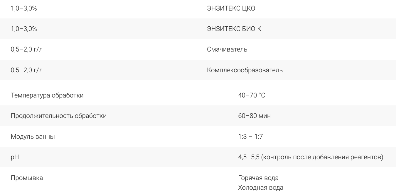 Механизм действия ЭНЗИТЕКС ЦКО гидролизует β-1,4-гликозидные связи целлюлозной части первичной стенки волокон — поверхность материала становится пористой и более восприимчивой к действию воды, химических реагентов и красителей, а также других ферментов и реагентов для удаления сопутствующих целлюлозе веществ (пектинов, гемицеллюлозов). Меры предосторожности и первой помощи Работы проводить в защитных очках и резиновых перчатках. При попадании на поврежденную кожу и слизистые оболочки средство может вызывать слабое раздражение. В этом случае это место необходимо обильно промыть проточной водой. Более полная информация приведена в паспорте безопасности.